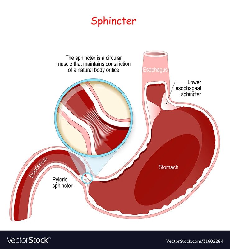 The stomach is seen between the esophagus and the small intestine as a flexible part of the alimentary canal. It is surrounded by the lower ribs and covered by liver & diaphragm (Fig. 9). The stomach includes two sphincters: the lower esophageal sphincter (Fig. 10) and the pyloric sphincter (Fig. 11) at the junction of the stomach with the duodenum. The gastro-esophageal sphincter guards the entrance to the stomach. It is a ring-like valve, which defines the bolus, and then relaxes and opens to allow it into the stomach. When the sphincter shuts, it ensures that the food moves in one direction. The stomach has anterior and posterior surfaces with lesser and greater curvatures as borders.