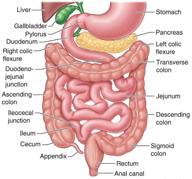 The small intestine is divided into three main parts: the duodenum, jejunum and ileum (Fig. 12). The first part is the duodenum (Fig. 13) which receives the chyme coming from the pyloric sphincter. Also, it receives enzymes from the pancreas and bile from the gallbladder to coat the chyme after mixing with the mucus. In the duodenum, the acids from the stomach are neutralized by alkalis, and the majority of proteins, fats and carbohydrates are absorbed into the bloodstream. The jejunum is the second part of the small intestine (Fig. 14), which, through its villi, is responsible for absorbing more carbohydrates and proteins to enter the bloodstream. However, the absorption of vitamin B12 and bile salts as well as any remaining nutrients are done by the ileum which is the distal and last part of the small intestine (Fig. 14). The waste products are moved in the ileocaecal valve through the peristaltic waves to the large intestine. The small intestine is the longest part of the intestinal tract as it is around 6 m in length.