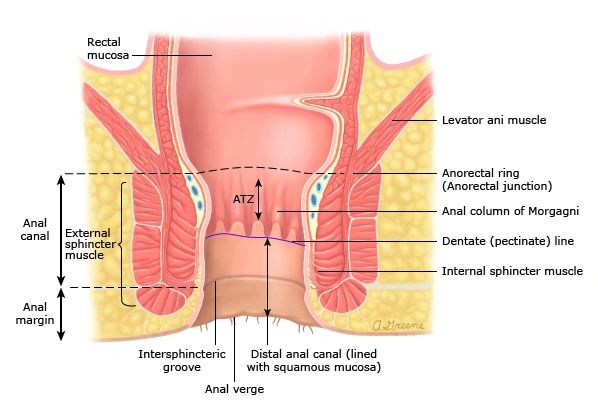 The anus is the digestive organ, which is responsible for the process of defecation (Fig. 16). It is the sphincter, which ends the gastrointestinal tract. Through relaxation, it allows the stool stored in the rectum to be released to the external environment.