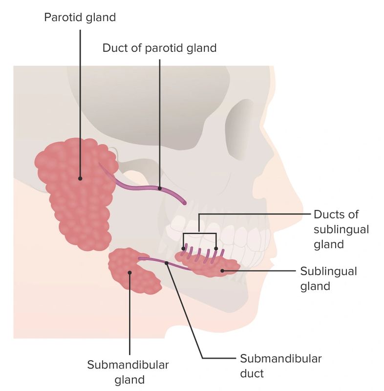 In the process of digestion, the function of mouth is related to the sense of olfaction which can identify the presence of food and consequently stimulate the production of various gastric juices by different digestive organs in preparation for digestion. There are three major salivary glands in the mouth: Parotid, submandibular and sublingual (Fig. 2). These glands produce saliva which acts as a lubricant and detergent through killing some of the microorganisms. This saliva also has a role in the chemical digestion through an enzyme called amylase that breaks starches down into sugars.