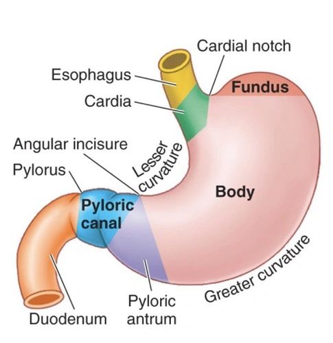 The stomach is a J-shaped organ with 25cm long in the digestive system. It is divided into four main parts: cardiac region (connected to esophagus), fundus (the upper part), body (the middle-lower) and pyloric region (the lower that is connected to duodenum) (Fig. 8). The stomach is responsible for storing the food and liquid, mixing them up with various digestive juices through the muscular action, and moving the resultant partially digested mixture into the small intestine. These actions refer to the mechanical processes undertaken by the stomach. However, some chemical digestive processes are conducted too in the stomach through the production of gastrin, a hormone, in the blood. A combination of acid gastric juices is release by the stomach to break down the food into chyme, a liquid. This high level of acidity plays a role in killing microorganisms. Also, hydrochloric acid, mucus and proteases (such as pepsin) are produced in the stomach. An empty adult stomach has a volume of about 45 mL but can expand to hold as much as 3 L, although a normally full stomach is about 1 L in volume.