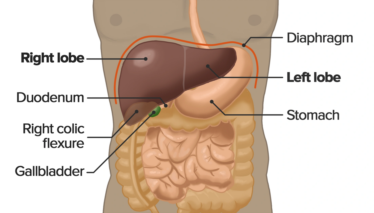 From the posteroinferior side, the liver is surrounded by the esophagus, the stomach, the duodenum, the right colic flexure, right kidney, suprarenal gland, and the gallbladder. From the anterior side, it is framed by the diaphragm, right and left costal margins, lower margins of both lungs and anterior abdominal wall at subcostal angle. The liver is partially surrounded by peritoneum, and it is completely covered by fibrous capsule (Fig 17).