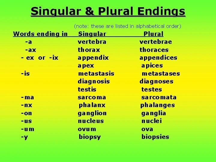 Forming plurals of medical terms are formed following normal English language conventions. Adding s or es to the end of a word (examples: muscle/muscles) or replacing the letter y with ies (examples: deformity/deformities). See (Fig. 1) for more detail.