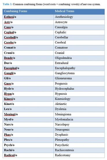 It refers to the vowel that aid pronunciation. It usually links all parts of medical word together. It may link two-word roots together, or it may link the word root with the suffix. The letters “o” and “i” are the two most common combining vowels. When linking two-word roots together, the first word root keeps the vowel even though the second word root starts with a vowel. However, in case of the vowel linking the word root with the suffix, and when the suffix starts with a vowel, the rule requires dropping the combining vowel from the word root (Table 1).