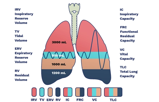 Respiratory volume refers to the volume of gases in the lungs at a given time, and it is defined as the tidal volume (TV). TV is affected by several factors including the physical condition, sex, age and size. The normal quiet rate of breathing is around 4,800 ml in healthy young men and 3,100 ml in healthy young women. It is called the vital capacity (VC), and it is measured through the following equation:
