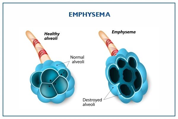 The enlargement of some alveoli because of the destruction of the walls of others is referred to as Emphysema (Fig. 16). In this pulmonary condition, patients exert incredible efforts to exhale as the fibrosis of the lungs, from the chronic inflammation, reduces the elasticity of the lungs. The outflow of air is obstacle through the collapse of the airways. Because air is retained in the lungs, oxygen exchange is surprisingly efficient, and cyanosis does not usually appear until late in the disease. Consequently, emphysema sufferers are sometimes referred to as “pink puffers.” However, overinflation of the lungs leads to a permanently expanded barrel chest.