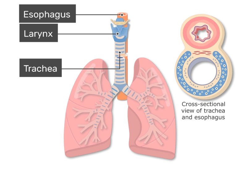 It is a cartilaginous c-shaped tube that connects the larynx to the bronchi and appears parallel to the 4th or 5th thoracic vertebrae with approximately 10 cm in length and 2.5 cm in diameter in adults (Fig. 6).