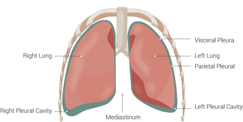 The thoracic cavity is divided into two main sections: the mediastinum and pleural cavity. While the mediastinum includes the heart and major vessels, the pleural cavity has two lungs, and it is existed on both sides of the mediastinum (Fig. 7). The lungs are air-filled organ occupying most of the thoracic cavity. It has a spongy formation making its protection with 12 ribs on either side of the cavity a must. Some differences are observed between the two lungs. While the right lung is split into three lobes, the left lung has only two (Fig. 8). It is due to the narrow space in the left of the thoracic cavity mostly occupied by the heart. The two lungs move freely within the thoracic cavity without friction thanks to the fluid lubricating the surface of the layers (Fig. 9). This fluid is produced by the pleura, a membrane covering the thoracic cavity.